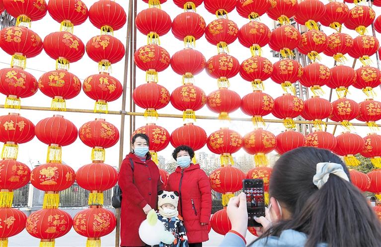 春節(jié)臨近,臨夏市街道、社區(qū)、公園張燈結彩,處處呈現(xiàn)一派喜慶祥和的節(jié)日氣氛。圖為市民們在東郊公園紅燈籠前拍照。 記者 史有東 攝