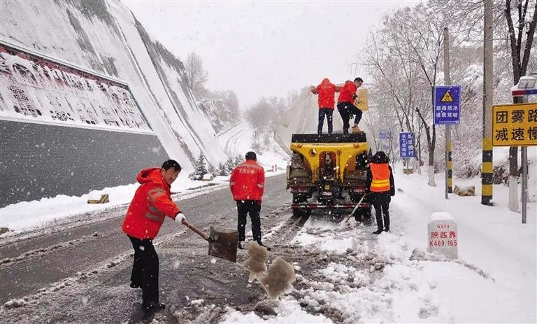 華池公路段在重點路段撒融雪劑和防滑料。(省交通廳供圖)