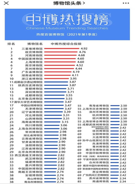近日,中國(guó)博物館熱搜榜發(fā)布今年第一季度全國(guó)熱搜博物館百?gòu)?qiáng)榜單。其中,三星堆博物館以4.92的熱搜綜合指數(shù)超過(guò)故宮博物院首登榜首。據(jù)悉,這也是三星堆博物館首次入選全國(guó)十大熱搜博物館并位列第一。