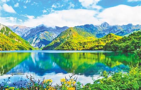 湖邊骨麻山巍峨聳立,湖水清澈澄碧,周圍森林茂密,草甸如茵。夏季漫山遍野的高山杜鵑競相怒放,形成高山、湖泊、森林、花海交織的美麗畫卷。