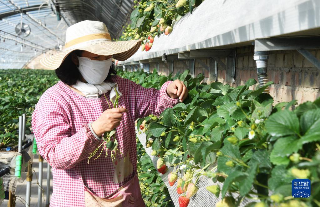 2月20日,工作人員在北京百旺農業(yè)種植園草莓種植大棚采摘草莓。
