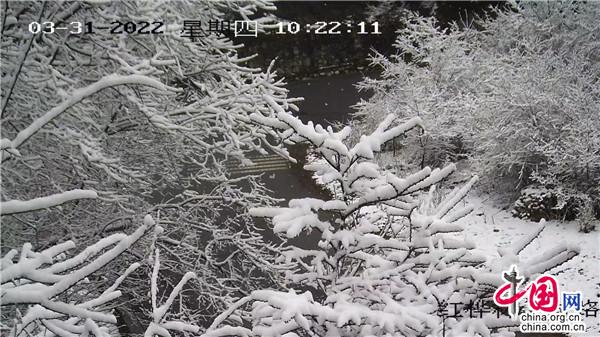 從山上到山下,景區(qū)皆是一片白雪皚皚,白雪覆蓋在冒出的新芽之上,翠綠的森林被雪披上了一層潔白的紗衣,增添了許多詩情畫意,別有一番風情。