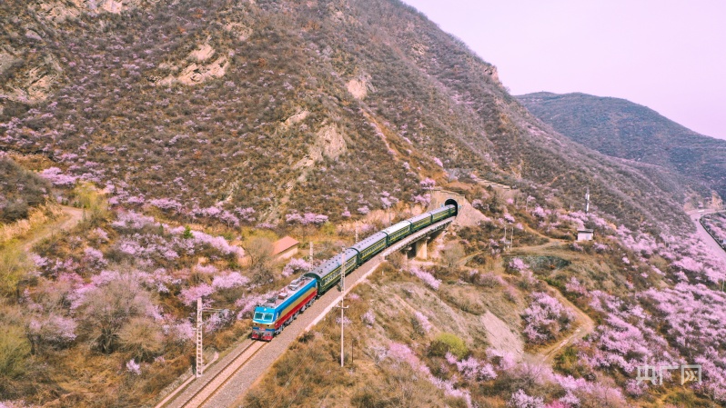 央廣網蘭州4月2日消息 (記者 邸文炯 通訊員 王紅剛 孫淑霞)近日,甘肅省崇信縣峽門寶中鐵路華亭市安口窯站附近的山上桃花盛開,花香四溢、如煙似霞?;疖噺纳街械乃淼来┬卸^,駛向一片春光燦爛。