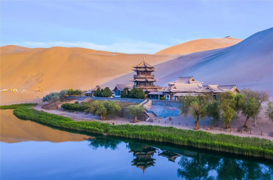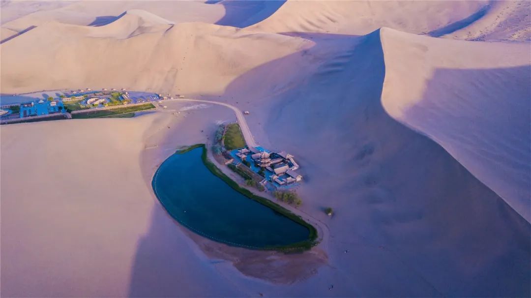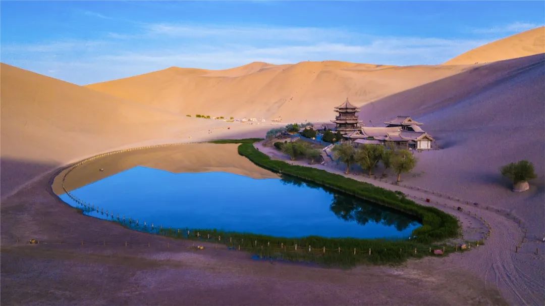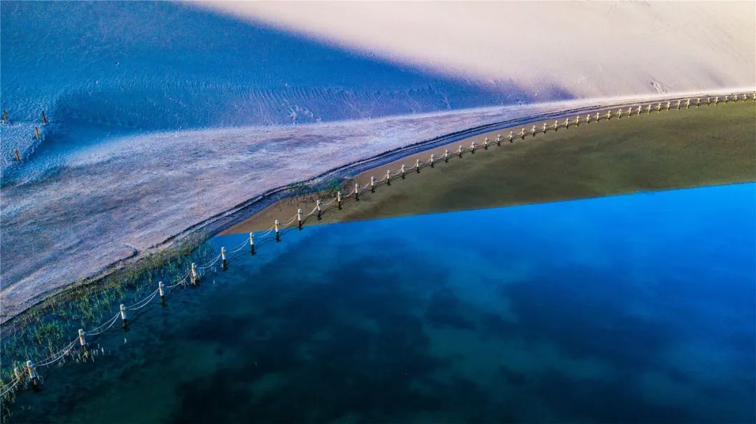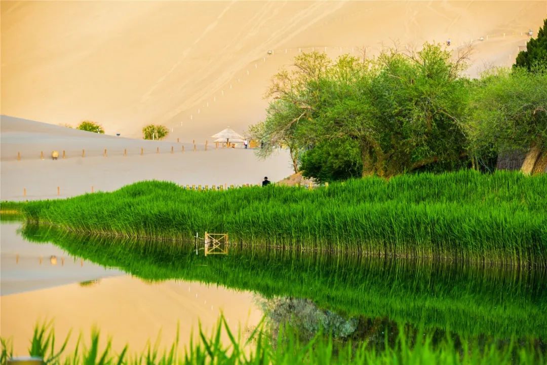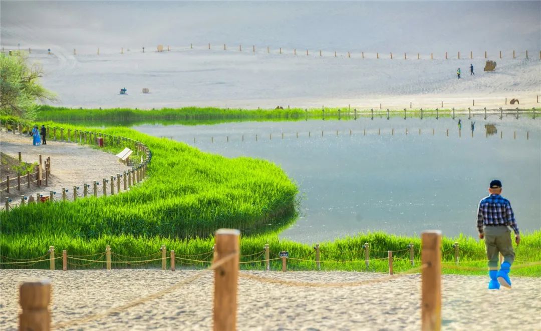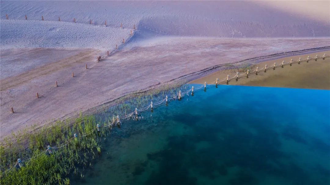 今年4月,敦煌市氣候溫潤,雨水較多,鳴沙山月牙泉景區(qū)草木蔥蘢,月牙泉水位持續(xù)上升。從4月23日在月牙泉航拍的圖片可以看出,月牙泉水域面積逐漸擴大,泉水已滲出月牙泉圍欄之外近1米的距離。據悉,3年前月牙泉泉水一直保持在圍欄之內。