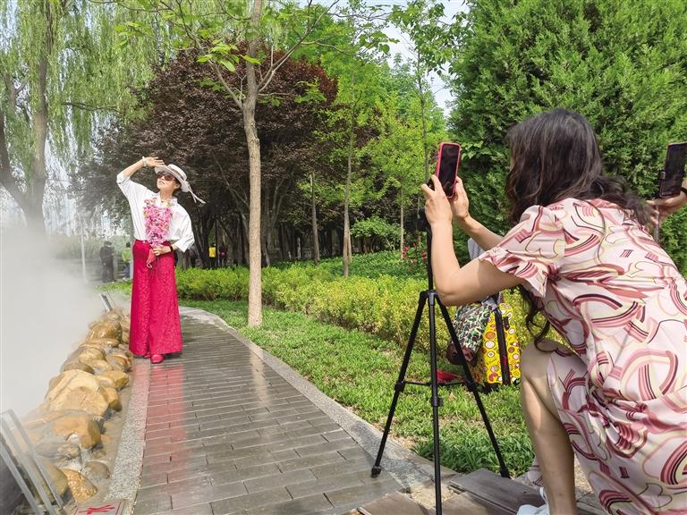“一枝獨(dú)秀”團(tuán)隊(duì)的王大姐和姐妹們帶著專(zhuān)屬攝影師正在這里攝影留念。王大姐告訴記者,這是她們今年第2次來(lái)這里打卡。“這里的花真美,每年我們都會(huì)來(lái),拍照發(fā)在網(wǎng)上,收獲無(wú)數(shù)點(diǎn)贊,心情別提多美了。”說(shuō)話間,姐妹們又?jǐn)[了幾個(gè)造型,攝影師按下快門(mén),精準(zhǔn)捕捉唯美瞬間。“4公里外的寓言故事園最近也特別火,過(guò)兩天我們就去打卡。”王大姐說(shuō)。