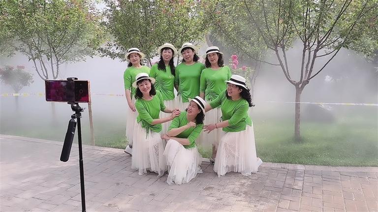 上午9時(shí)30分,水池中漸漸漫出淡淡的煙霧,時(shí)而稀薄,時(shí)而濃厚,隨著陣陣微風(fēng)飄蕩在小橋流水間。“準(zhǔn)備放音樂(lè),我在原地來(lái)回轉(zhuǎn),你用手機(jī)豎屏拍。”……記者穿梭于人群間,這樣的聲音不絕于耳。“姐妹花”龔大姐和田大姐身穿正裝,各自圍上了顏色艷麗的圍巾,正站在鏡頭前直播。“這里非常美,像仙境一樣。綠化也做得特別好,公園里的綠植和鮮花種類(lèi)繁多,很好看。我們是第一次來(lái),希望蘭州多打造一些這樣的美景。”