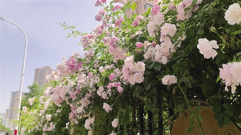 除了仙氣飄飄的“瑤池”,安寧區(qū)還有一處網(wǎng)紅打卡地非常火爆,那就是位于黃河印象路北段近400米的花街。上午11時(shí),記者在現(xiàn)場(chǎng)看到道路兩側(cè)開(kāi)滿了鮮花。道路東側(cè)的圍欄是銀灘雅苑小區(qū)的外墻,以粉色、白色為主的薔薇開(kāi)得正艷,微風(fēng)拂過(guò),掛滿花朵的枝干輕輕搖曳。道路西側(cè)開(kāi)滿了4種顏色的月季花,蜜蜂在花間飛舞采蜜,一眼望去,繁花似錦。