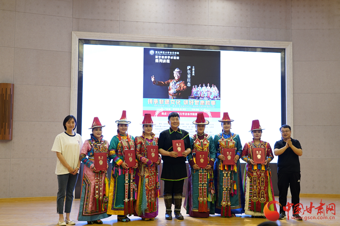 中國甘肅網(wǎng)7月1日訊 近日,甘肅裕固族歌唱組合薩爾組合主唱薩爾帶著他的裕固族伙伴們走進西北師范大學(xué)音樂學(xué)院,進行“課程思政教學(xué)實踐”——《裕固族民歌中的服飾文化》交流分享活動。同時,西北師范大學(xué)音樂學(xué)院副院長晏曉東為七位裕固族民間音樂傳播者頒發(fā)了音樂學(xué)院聘書。
