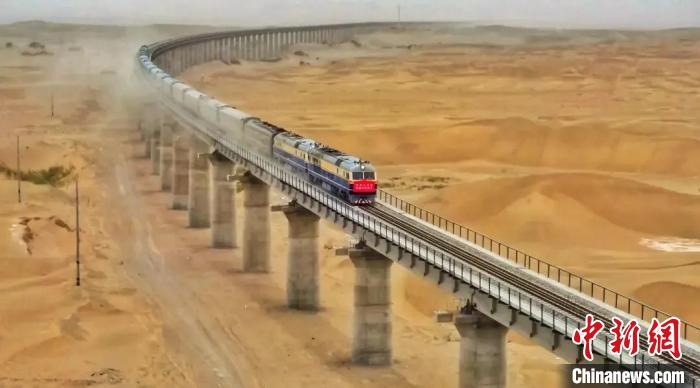 奔跑在塔克拉瑪干沙漠沙漠里和若鐵路上的列車。資料圖 新疆鐵路部門供圖