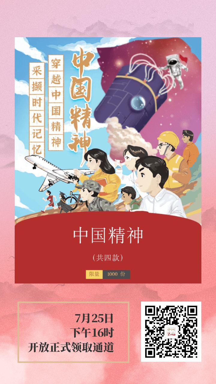 7月25日下午16時(shí),中國網(wǎng)旗下中網(wǎng)藝云數(shù)字藏品平臺(tái)發(fā)布上線首批藏品并將開放正式領(lǐng)取通道,大眾通過中網(wǎng)藝云線上渠道可對《中國精神》系列藏品進(jìn)行免費(fèi)領(lǐng)取。本期藏品總數(shù)量1000份,共四款,全部用于免費(fèi)發(fā)行。其中歷史主動(dòng)精神400份、首創(chuàng)精神300份、航空強(qiáng)國精神200份、抗疫精神100份,采取“盲盒玩法”隨機(jī)獲取。