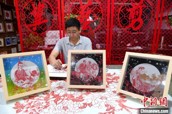 8月4日,是中國傳統(tǒng)節(jié)日七夕節(jié)。河北省衡水市阜城縣剪紙藝人尤金水創(chuàng)作了《牛郎》《織女》《鵲橋相會(huì)》三幅“七夕”剪紙作品,傳遞千年浪漫情。據(jù)介紹,作品采用阜城剪紙陽刻的手法,裝裱后利用立體投影的方式,可以把畫面投影到“月亮”上,既浪漫又神奇。