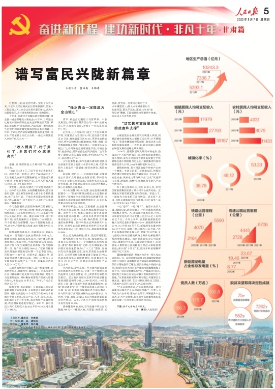 8月7日,人民日?qǐng)?bào)刊發(fā)“奮進(jìn)新征程 建功新時(shí)代·非凡十年”甘肅篇,重磅推出兩塊整版,聚焦黨的十八大以來(lái),隴原兒女牢記習(xí)近平總書(shū)記的殷切囑托,踔厲奮發(fā)、銳意進(jìn)取,埋頭苦干、勇毅前行,加快建設(shè)幸福美好新甘肅,不斷開(kāi)創(chuàng)富民興隴新局面。