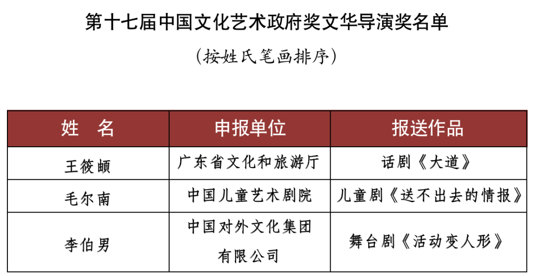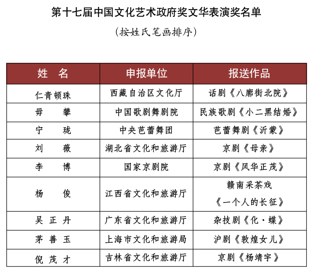 9月15日,文化和旅游部對外公布了《第十七屆文華獎獲獎名單》。舞劇《五星出東方》(北京市文化和旅游局選送)、話劇《塞罕長歌》(河北省文化和旅游廳選送)、舞蹈詩劇《只此青綠》--舞繪《千里江山圖》(中國東方演藝集團有限公司選送)等15個作品獲得第十七屆中國文化藝術政府獎文華大獎。