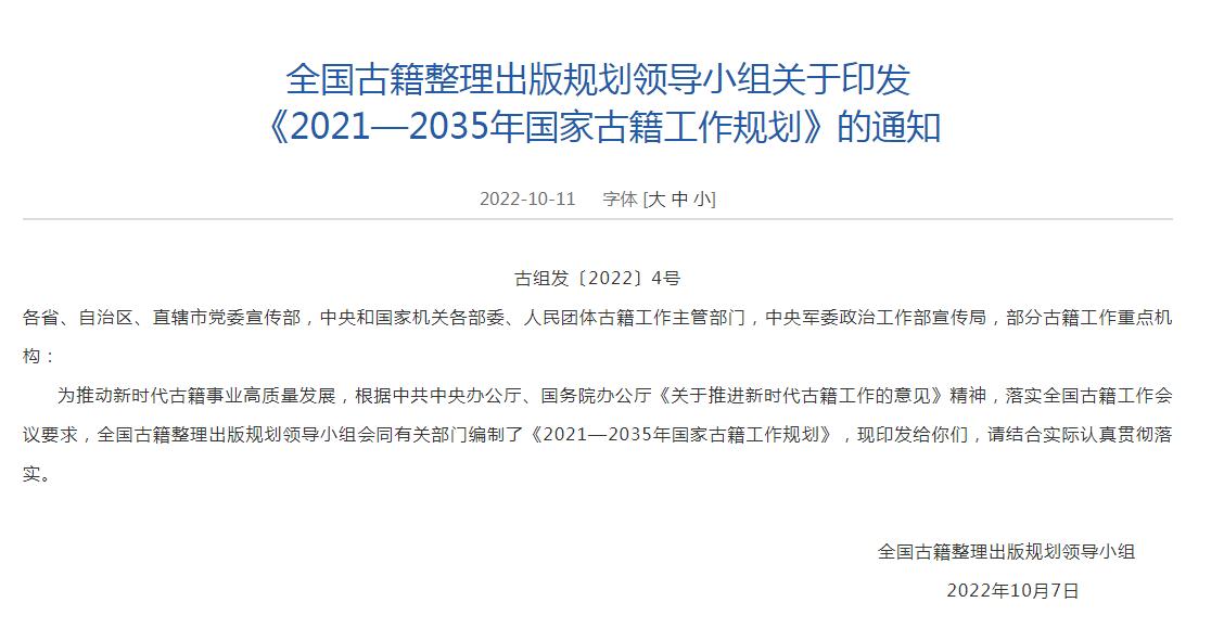 12日,據(jù)國家新聞出版署網(wǎng)站消息,全國古籍整理出版規(guī)劃領(lǐng)導(dǎo)小組會同有關(guān)部門編制了《2021—2035年國家古籍工作規(guī)劃》,其中提到,至2035年,古籍工作體制機制更加完善,以重大工程為引領(lǐng),加強古籍工作全局性謀劃,重點實施 《永樂大典》、敦煌文獻系統(tǒng)性保護整理出版工程等。