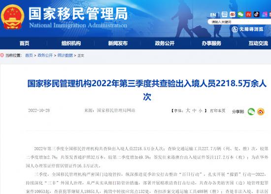 來自國家移民管理局的數(shù)據(jù)顯示,2022年第三季度,全國移民管理機構共查驗出入境人員2218.5萬余人次;共簽發(fā)普通護照32萬本,較第二季度增加49.5%;簽發(fā)往來港澳臺出入境證件簽注117.2萬本(枚);為在華外國人辦理簽證停留居留證件16.5萬證次。