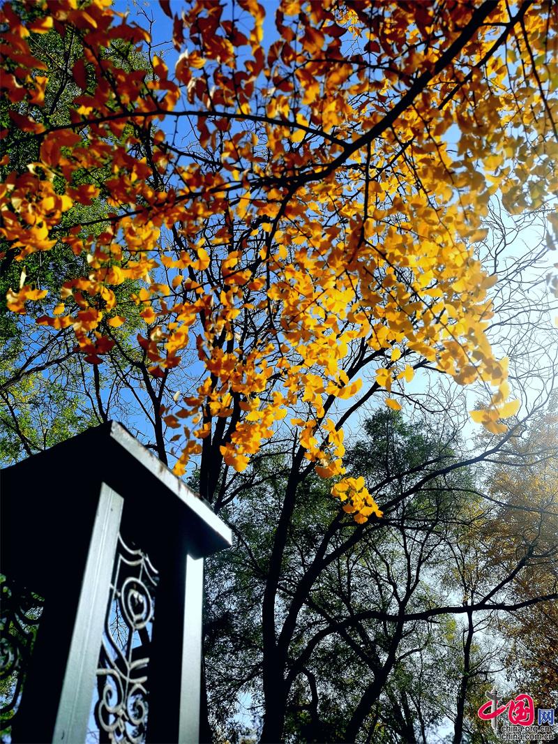 而圓明園的秋色,同樣不落秋之美。黃葉與殘垣相襯,透露出特有的滄桑與悲涼。它美得那么寂寞,那么孤獨。只有在銀杏大道上,才能聽到喧鬧之中,那熙熙攘攘的歡呼之聲。