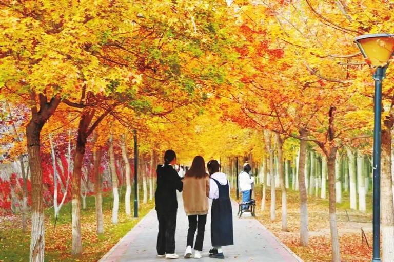 微風(fēng)輕拂,嬌黃的樹葉紛紛飄落,陽光透過葉片滲出幾分清朗,這是專屬秋的浪漫。隨便鋪開畫紙,蘸取一點(diǎn)點(diǎn)秋色,藍(lán)天、紅墻、金葉……都是最美的色調(diào)。古樸靜雅的校園彌漫著秋思,斑駁的陽光灑在圖書館的墻上,在濃濃的書卷氣中把農(nóng)歷十月寫進(jìn)秋的詩行,有思念、有沉淀、有墨香……蘭州“醉”美的大學(xué)校園,每一片落葉都是美的化身,綿延了時(shí)光,溫情了步履……
