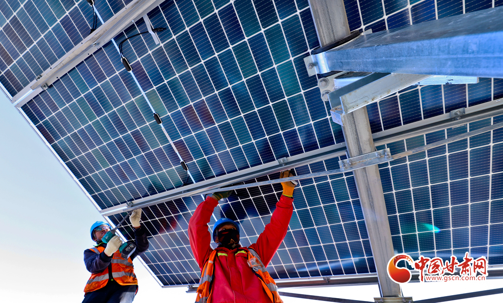 11月17日,甘肅省張掖市甘州區(qū)南灘中能綠電南灘30萬(wàn)千瓦光伏建設(shè)現(xiàn)場(chǎng),工人們正在安裝光伏板。