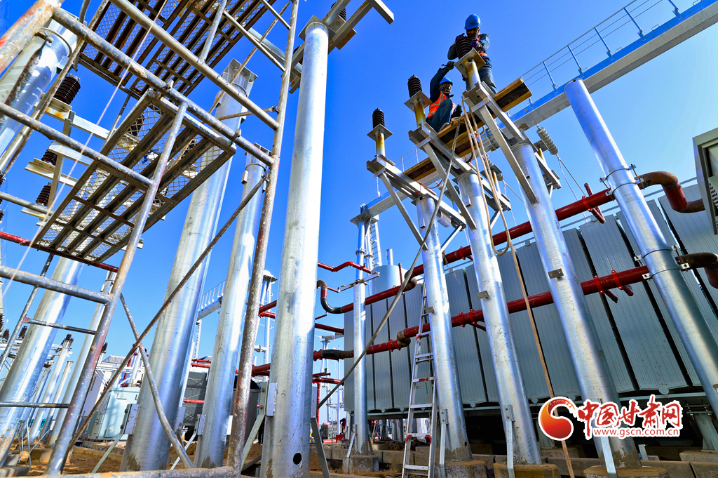 11月17日,甘肅省張掖市甘州區(qū)南灘中能綠電南灘30萬(wàn)千瓦光伏建設(shè)現(xiàn)場(chǎng),工人們正在進(jìn)行變電設(shè)備安裝。