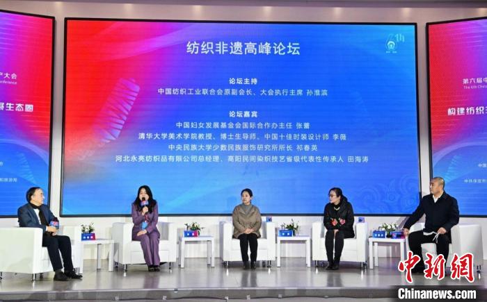 中國婦女發(fā)展基金會國際合作辦主任張蕾,清華大學美術(shù)學院教授、中國十佳時裝設(shè)計師李薇,中央民族大學少數(shù)民族服飾研究所所長祁春英,河北永亮紡織品有限公司總經(jīng)理、高陽民間染織技藝省級代表性傳承人田海濤等分享了各自在紡織非遺方面的實踐故事。