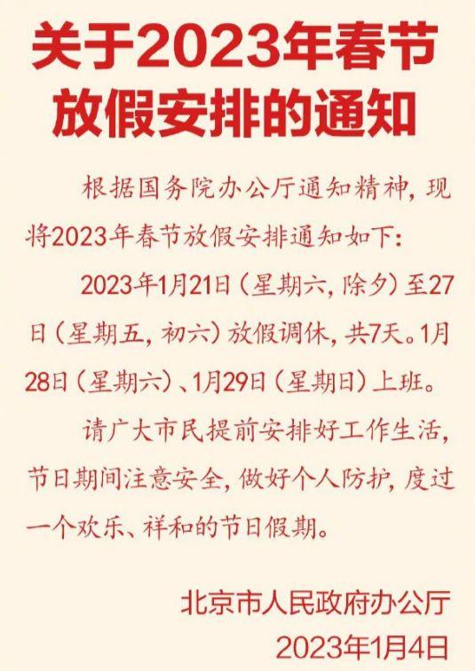 1月4日,北京市人民政府辦公廳發(fā)布《關(guān)于2023年春節(jié)放假安排的通知》(以下簡稱《通知》)。《通知》指出,根據(jù)國務(wù)院辦公廳通知精神,現(xiàn)將2023年春節(jié)放假安排通知如下:2023年1月21日(星期六,除夕)至27日(星期五,初六)放假調(diào)休,共7天。1月28日(星期六)、1月29日(星期日)上班。