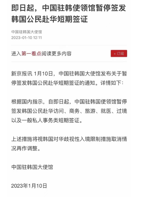 今天,中國駐韓國大使館發(fā)布《關于暫停簽發(fā)韓國公民赴華短期簽證的通知》(以下簡稱《通知》)。通知稱,根據(jù)國內指示,自即日起,中國駐韓國使領館暫停簽發(fā)韓國公民赴華訪問、商務、旅游、就醫(yī)、過境以及一般私人事務類短期簽證。