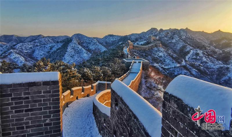皚皚白雪覆蓋長城內外,銀裝素裹金山嶺氣勢磅礴。