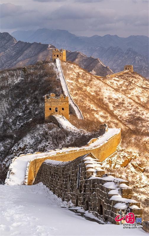 雪后,金色陽光映襯下,河北承德灤平縣的金山嶺長城巍峨壯觀,美如畫卷。