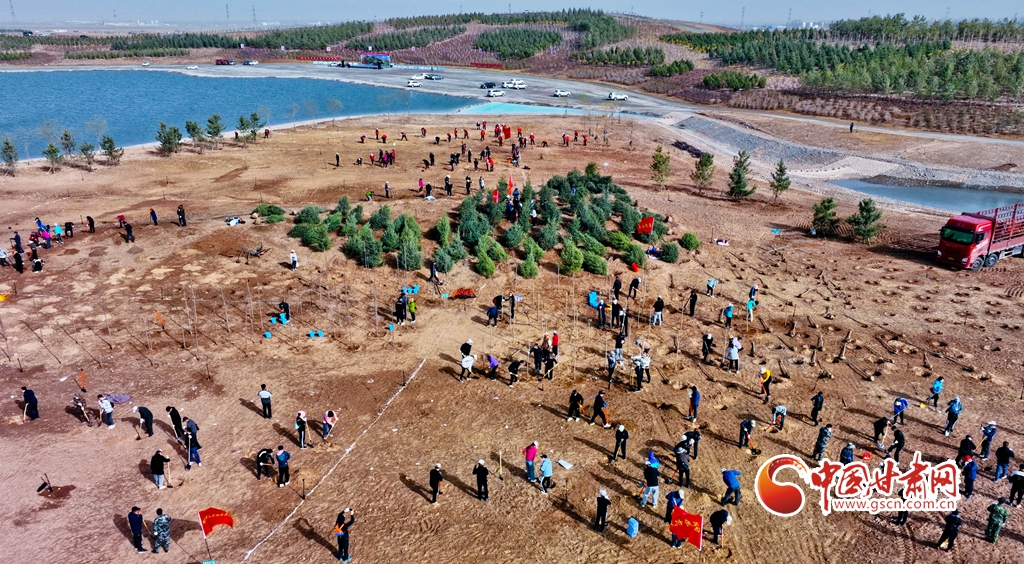 4月11日,在甘肅省張掖市甘州區(qū)黑河西岸黑河灘彩虹林海生態(tài)造林示范區(qū)內(nèi),眾多干部職工正在植樹(shù)。