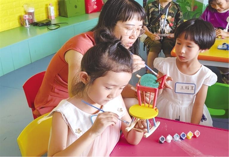 為了讓孩子們切身體驗魯班的精湛技藝,在手工制作環(huán)節(jié),大家進(jìn)行了榫卯結(jié)構(gòu)的椅子模型拼裝。在主持人的帶領(lǐng)指導(dǎo)下,孩子們將椅背、椅腿按照凹槽精準(zhǔn)嵌入,并為其染上五彩底色、繪制精美圖案,一個個“小工匠們”便歡天喜地地完成了自己的手工作品。