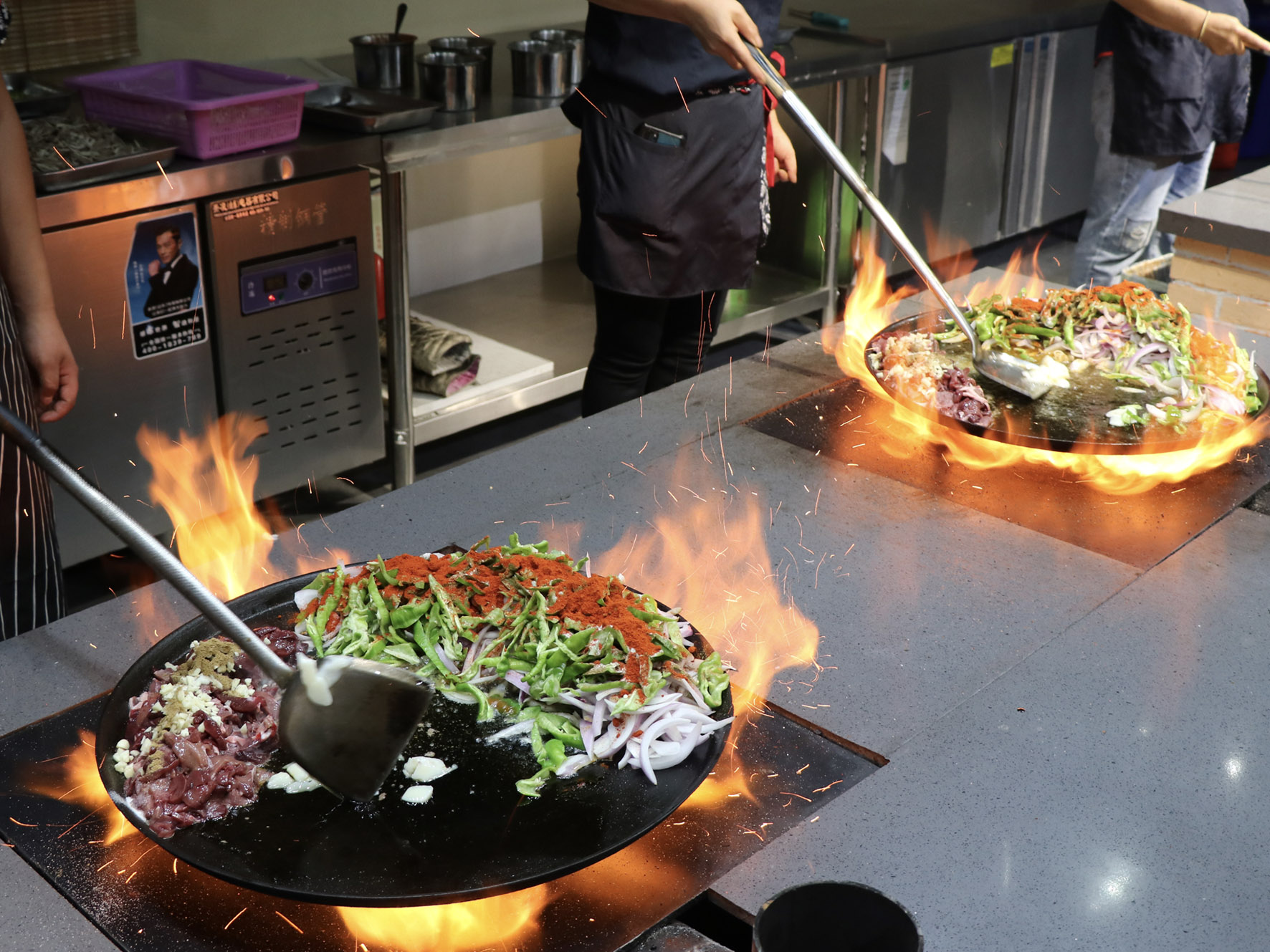 最美味的食物往往來自于最樸素的食材,只見店家將切好的羊肝、肺、肚、腸、心等佐以洋蔥、青椒下入一個鑄鐵鏊子里,再加上幾勺鹽和辣椒面,開始用猛火爆炒,火星四濺,一頓撥拉之后,待到七分熟左右再放入提前準備好的白餅塊一起翻炒即可。