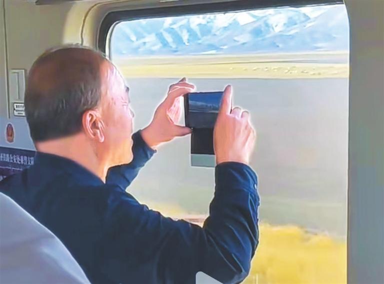 視頻中,一男子舉著手機(jī),透過車窗面對(duì)著藍(lán)天、雪山、草原情不自禁地抒情:祁連山下,各族兒女兩千多年來在華夏的文明史上書寫了鞏固民族大業(yè)、實(shí)現(xiàn)祖國統(tǒng)一、民族繁榮的恢弘歷史。朋友們,來張掖!感受兩千年的絲綢之路,感悟現(xiàn)代的動(dòng)車奔跑在祖國的大地上,讓中華在實(shí)現(xiàn)偉大復(fù)興的磅礴征程中恢弘勃發(fā)的新長(zhǎng)征、新歷史。