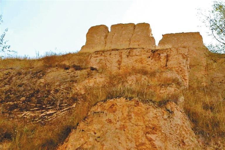 在威戎鎮(zhèn)見到的第一處遺存,是位于威戎鎮(zhèn)廣場后的一處臺地。這一處遺存,是一段殘破的老城墻,以及一座形似堡樓的殘垣。站在臺地之下,仰望斷墻,人工修筑的痕跡十分明顯,層層黃土夯筑,因為廢棄殘破而長滿了荒草。走近堡樓,可以看見當時修筑時搭建木椽的孔洞,還有很多手掌大小的圓形石塊。