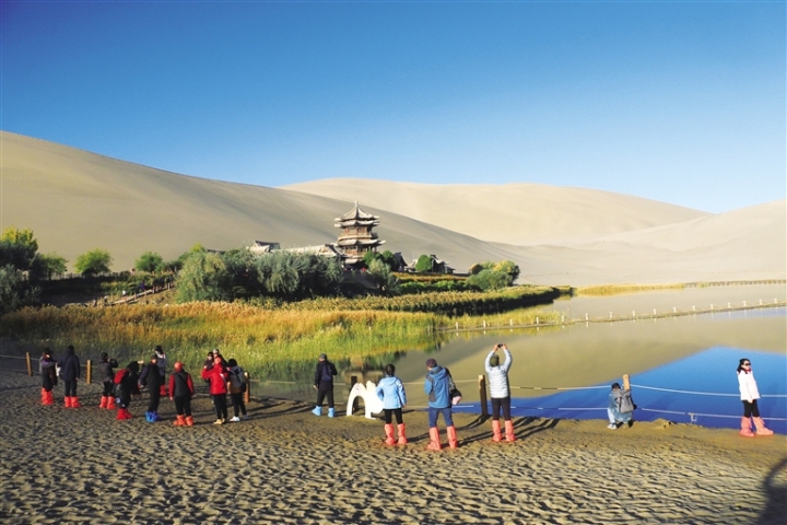 敦煌市文旅部門統(tǒng)計數(shù)據(jù)顯示,10月7日以來,鳴沙山·月牙泉景區(qū)日均接待游客近萬人。