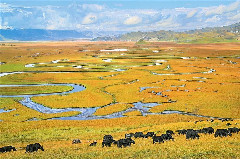 冬日的暖陽(yáng)下,瑪曲縣的廣袤草原上牦牛成群。