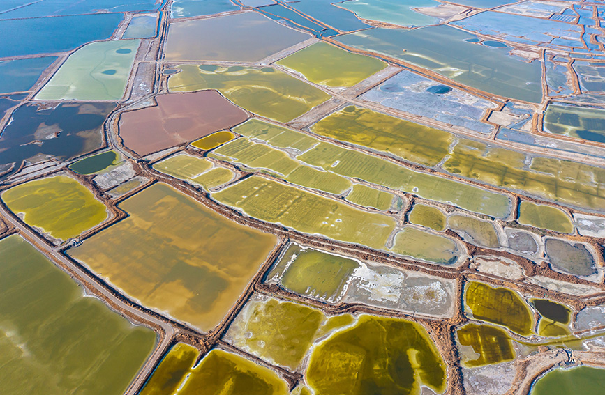冬日時節(jié),隨著氣溫降低,山西運城鹽湖湖面上,色彩斑斕、景色如畫。芒硝結晶,“硝花”似雪,鹽湖里各種線條和幾何圖案,猶如大自然的調色盤,十分迷人。