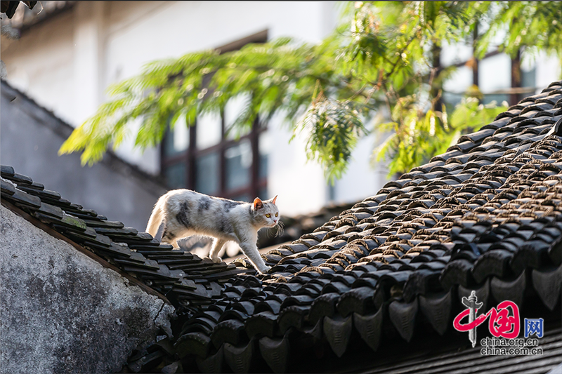 在毛孩子眼里,這就是包容一切活動(dòng)的「游樂場(chǎng)」,片片青瓦上留下梅花印?;蛟S你也該往古鎮(zhèn)的屋頂上瞧,檐角翹伸、清風(fēng)古韻,讓人心曠神迷?;蛲侵回堃粯优噬细咛?,推窗看那水那橋,那木門青瓦,就是江南水鄉(xiāng)的具象。