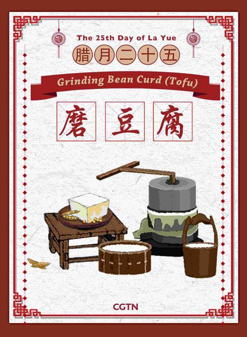 傳說玉皇大帝會在臘月二十五下凡巡視人間,看家家戶戶是否都過著誠實勤儉的生活。為了表現得節(jié)儉以獲得玉皇大帝降福,傳統(tǒng)上人們會磨豆腐來吃,豆腐在中國是一種便宜的食品。