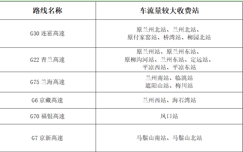 ?。ㄒ唬└咚俟分攸c路段。以蘭州為中心的放射線及其聯(lián)絡(luò)線為重點。如:G30連霍高速,G22青蘭高速,G6京藏高速,G70福銀高速,G75蘭海高速,S1機場高速等路段及相關(guān)收費站、服務(wù)區(qū)。
