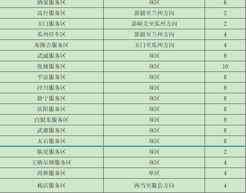 (二)重點客運車站班線。省內(nèi)二級及以上客運站正常營運,以省會城市、人口密集市縣的站點及之間的班線為重點。如:蘭州客運東站、南站,天水汽車站等站點以及蘭州—定西、蘭州—西峰、臨洮—平川、舟曲—武都、金昌—武威等客運班線。 (三)車流量較大服務(wù)區(qū)。預(yù)計我省車流量較大服務(wù)區(qū)為定西服務(wù)區(qū)、酒泉服務(wù)區(qū)、武威服務(wù)區(qū)、高臺服務(wù)區(qū)、長城驛服務(wù)區(qū)、靜寧服務(wù)區(qū)、會寧服務(wù)區(qū)、太石服務(wù)區(qū)、蘭州北服務(wù)區(qū)、接駕嘴服務(wù)區(qū)、永登服務(wù)區(qū)。