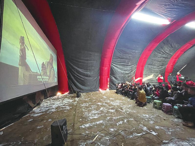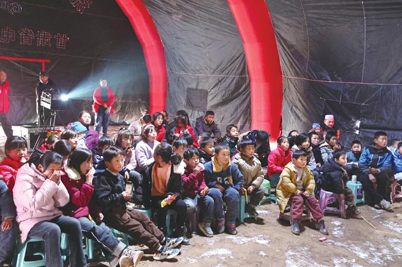 冬日的嚴寒擋不住震區(qū)群眾的觀影熱情。帳篷內(nèi),電影《英雄若蘭》《新神榜:楊戩》先后放映,孩子們分排而坐,被影片生動有趣、跌宕起伏的情節(jié)深深吸引,不時傳出歡聲笑語。“志愿者給我們放電影,豐富了我們的文化生活。”正在觀影的村民呂鵬說。
