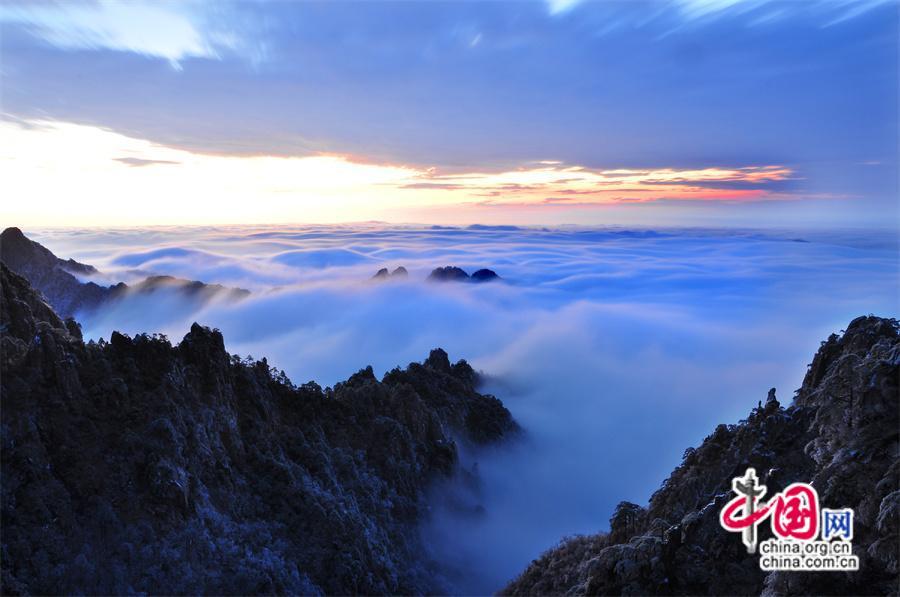 原標(biāo)題:只有一個(gè)黃山:雪后云海日出朝霞描繪絢麗畫卷