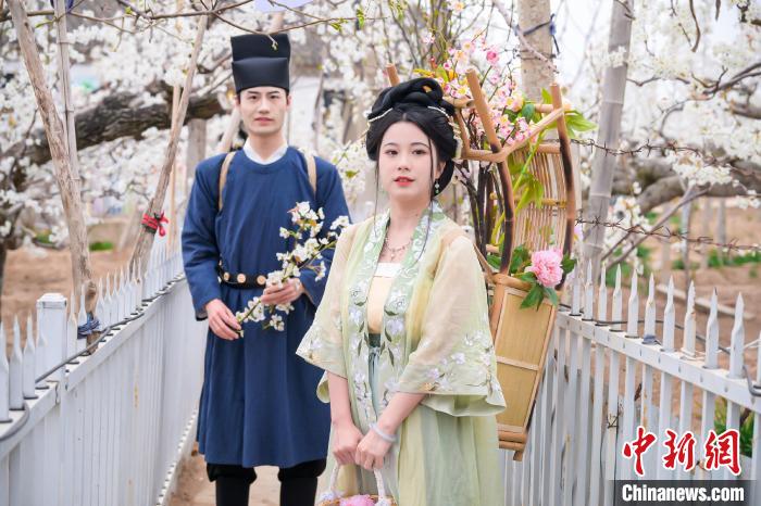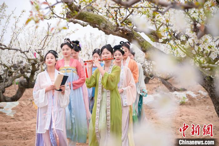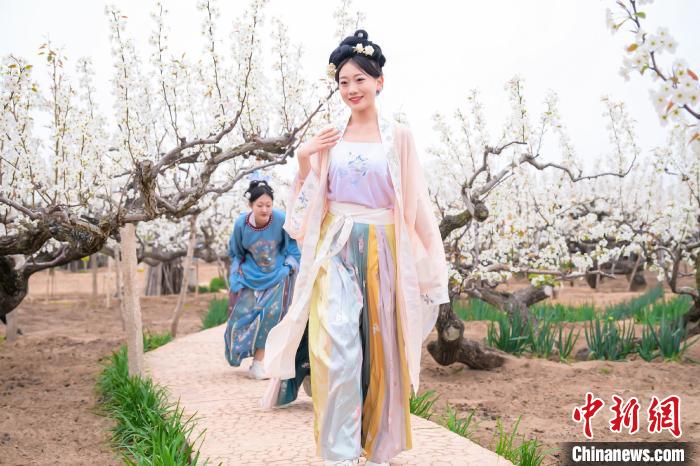 原標(biāo)題:山東萊陽(yáng)萬(wàn)畝梨花惹人醉 民眾著古裝游園