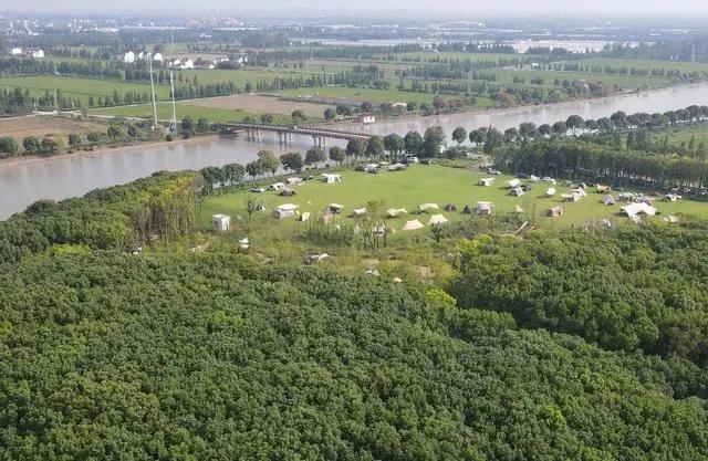 在上海松江區(qū)一處營(yíng)地,市民游客在河邊草地上搭起帳篷。(2023年9月29日,無(wú)人機(jī)照片)。新華社記者 方喆攝