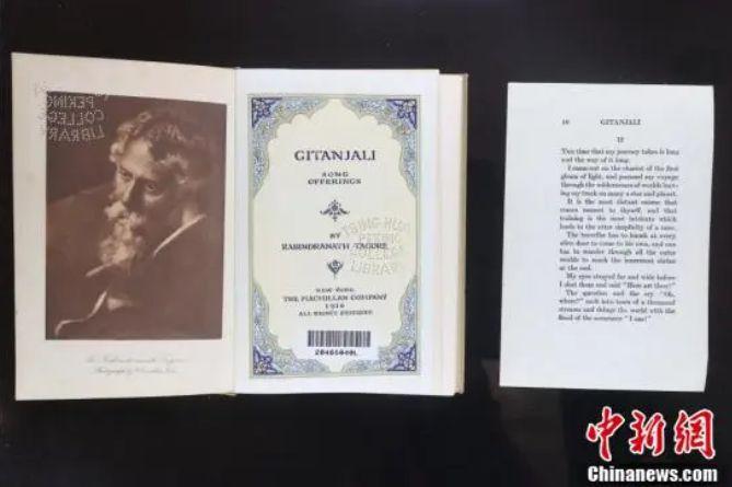 圖為清華大學(xué)圖書館收藏的紐約1916年英譯本泰戈爾詩集《吉檀迦利》。中新社記者 易海菲 攝