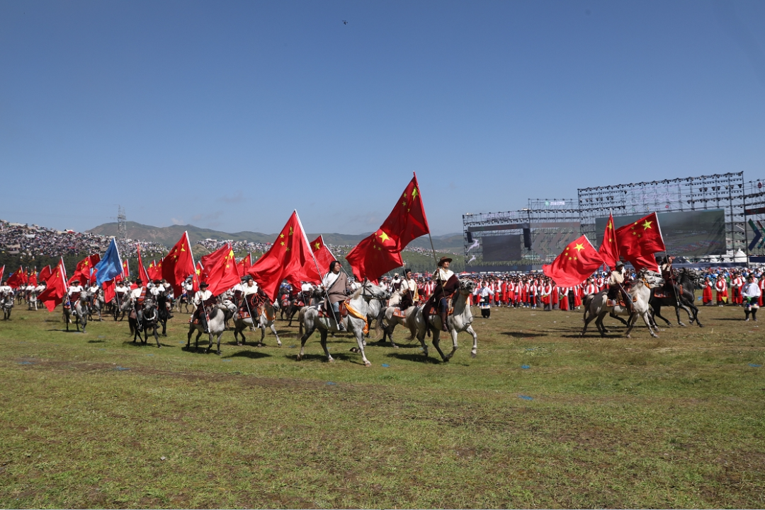 草原騎手乘著矯健的駿馬高舉著鮮艷的五星紅旗從主席臺前奔馳而過,讓在場的數(shù)萬觀眾贊嘆不已,呈現(xiàn)出一個絢麗多彩的甘南、和諧穩(wěn)定的甘南、朝氣蓬勃的甘南、包容開放的甘南、團(tuán)結(jié)奮進(jìn)的甘南。