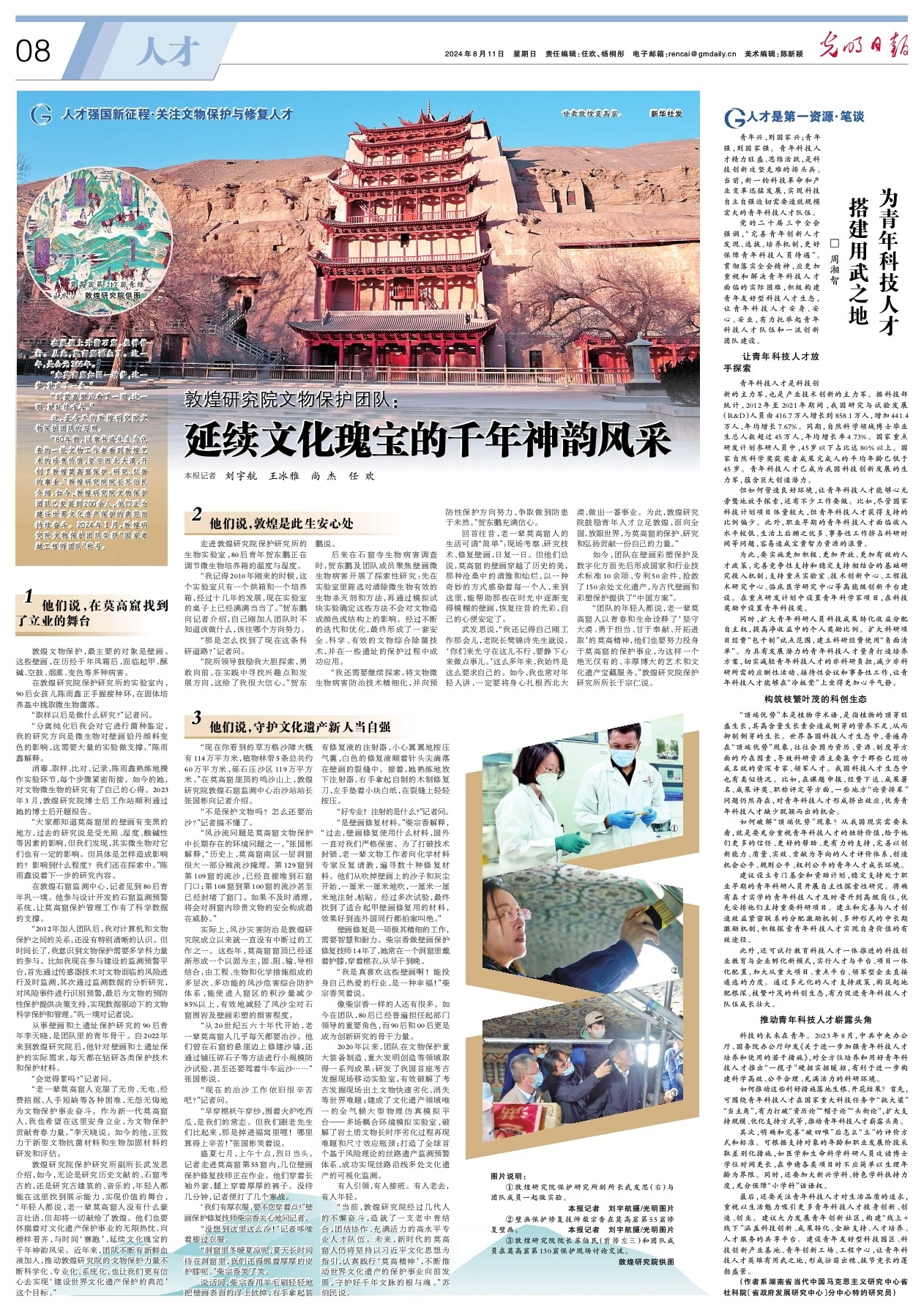 敦煌研究院保護(hù)研究所副所長武發(fā)思介紹,如今,無論是研究歷史文獻(xiàn)的、石窟考古的,還是研究古建筑的、音樂的,年輕人都能在這里找到展示能力、實(shí)現(xiàn)價(jià)值的舞臺,“年輕人都說,老一輩莫高窟人沒有什么豪言壯語,但卻將一切獻(xiàn)給了敦煌。他們也要懷揣著對文化遺產(chǎn)保護(hù)事業(yè)的無限熱忱,向榜樣看齊,與時間‘賽跑’,延續(xù)文化瑰寶的千年神韻風(fēng)采。近年來,團(tuán)隊(duì)不斷有新鮮血液加入,推動敦煌研究院的文物保護(hù)力量不斷科學(xué)化、專業(yè)化、系統(tǒng)化,也讓我們更有信心去實(shí)現(xiàn)‘建設(shè)世界文化遺產(chǎn)保護(hù)的典范’這個目標(biāo)。”