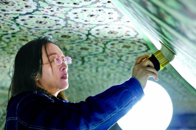 壁畫保護(hù)修復(fù)技師柴宗香在莫高窟第55窟修復(fù)壁畫。本報(bào)記者 劉宇航攝/光明圖片