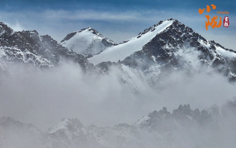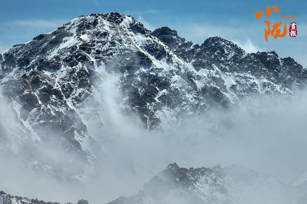 雪山山巒間,云霧回旋飄動(dòng),彌漫舒展,如海浪起伏、波濤滾滾一般,與湛藍(lán)天空相互映襯,壯美如畫(huà)。