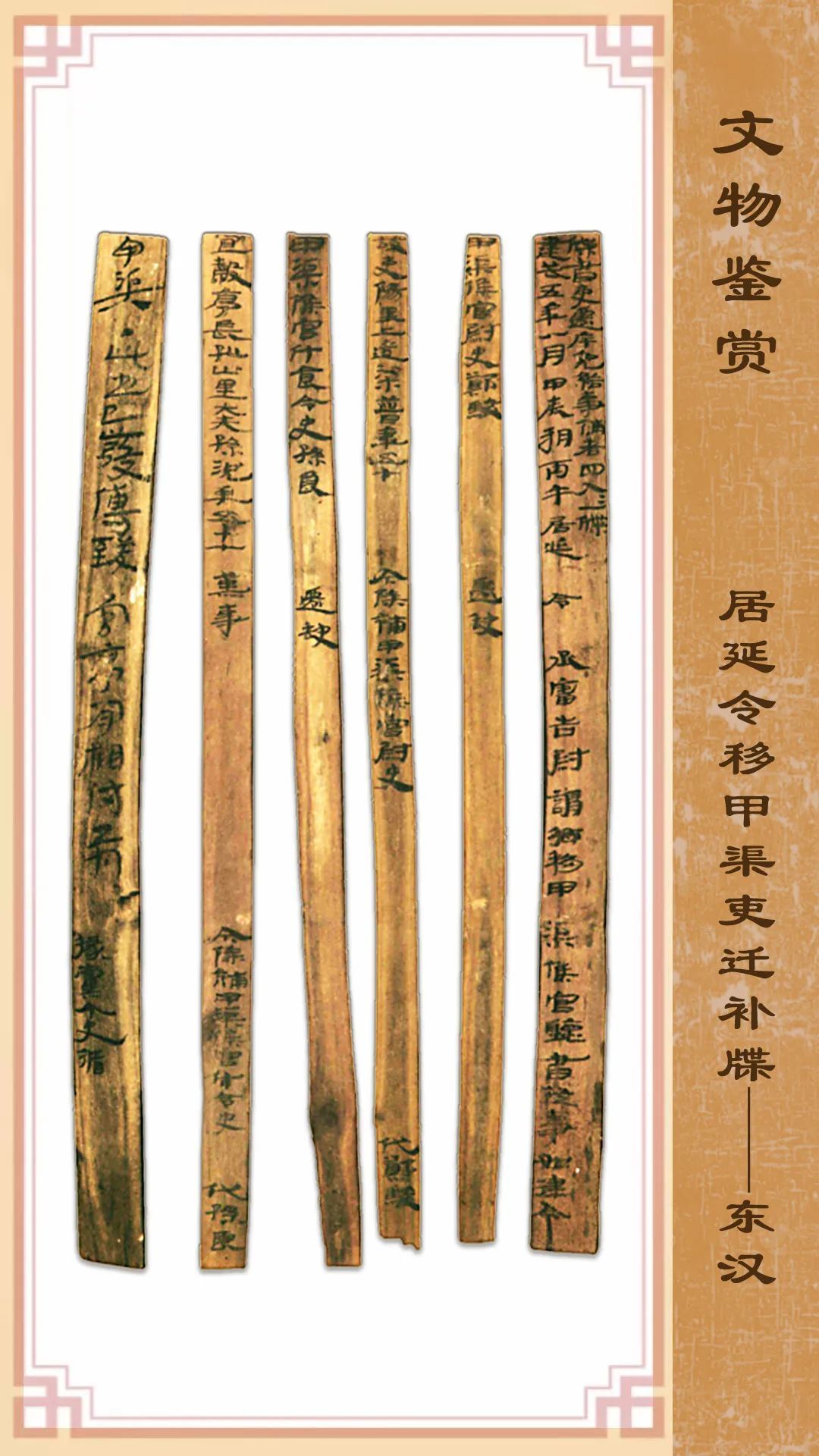 第一簡文字為:“牒書:吏遷、斥免、給事補者四人,人一牒。建武五年八月甲辰朔丙午,居延令 丞審告尉:謂鄉(xiāng)移甲渠候官,聽書從事,如律令。”這是文件的標(biāo)題和行文要求。“居延令”之后尚留空白,說明這是一份還未正式生效的官員任免文件。其他4簡則是此次任免人員和崗位的具體內(nèi)容。在簡牘背面書有此文件的起草人掾黨和令史循二人,屬于共同署名。該文書對了解漢代基層吏員的任免、除補等基本程式有重要參考價值?,F(xiàn)藏甘肅簡牘博物館。